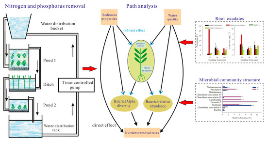 - Ma, L.; Yang, L.; Liu, W.; Zhang, Y.; Zhou, Q.; Wu, Z.; He, F. Effects of root exudates on rhizosphere bacteria and nutrient removal in pond-ditch circulation systems (PDCSs) for rural wastewater treatment. Sci. Total Environ. 2021, 785, 147282. [Google Scholar] [CrossRef] [PubMed]