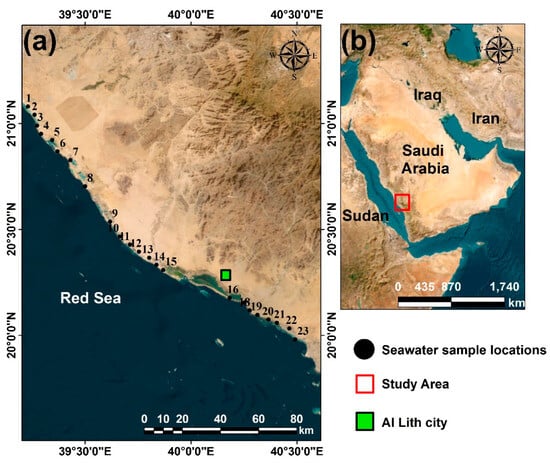 Al Lith City is located in the Makkah region of Saudi Arabia, approximately 180–200 Km to the south of Jeddah City. The basement rocks of the Arabian Shield are found in the eastern portion of the Al Lith area and run parallel to the Red Sea. They were formed by the uplifting of Precambrian rock due to Red Sea rifting and collectively reflect the diverse geological history of the area, shaped by various tectonic and environmental processes over millions of years []. On the other hand, the western half of the area is covered with deposits of sand, gravel, silt, and mud from the Quaternary period [,]. A total of twenty-three samples of saltwater from the subtidal zone were obtained (Figure 1). The sediment in the beach under study consists of mud, fine- to coarse-grained sands, and terrestrial gravels. It contains various marine organisms, such as corals, gastropods, bivalves, echinoids, seagrass, and foraminifers. These organisms have been transported to the beach by waves and currents [].