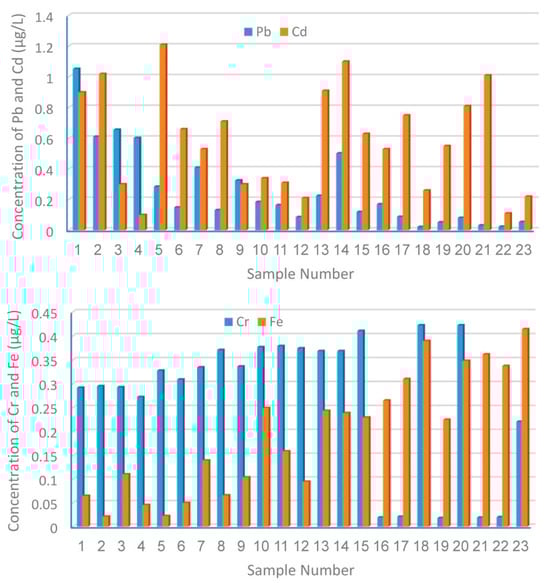 Supplementary Table S2 displays the lowest, highest, and average levels of HMs as well as the outcomes of the pollution indices employed in this study. The average concentrations of HMs took the following descending order: Zn (6.616 μg/L) > Cd (0.59 μg/L) > Pb (0.284 μg/L) > Cr (0.26860 μg/L) > Fe (0.197 μg/L). The distribution of HMs in each sample location within the research area exhibited a fluctuating pattern without a specific orientation (Figure 2). Nevertheless, certain individual samples exhibited variations in HM amounts, either increasing or decreasing. For example, sample 1, located in the northern region of the research area, had the greatest concentrations of zinc and lead, measuring 30.800 and 1.053 μg/L, respectively. Conversely, samples 20 and 18 in the southern region displayed the lowest concentrations of these two HMs, measuring 1.00 and 0.021 μg/L, respectively. The samples with the highest concentrations of chromium and iron were 20 and 23, respectively, in the southern region of the research area. The concentration of chromium in sample 20 was 0.423 μg/L, while the concentration of iron in sample 23 was 0.414 μg/L. On the other hand, the samples with the lowest concentrations of chromium and iron were 19 and 2, respectively. The concentration of chromium in sample 19 was 0.018 μg/L, while the concentration of iron in sample 2 was 0.021 μg/L. In relation to Cd, samples 2 and 4 in the northern region of the research area exhibited the greatest and lowest concentrations (1.020 and 0.100 μg/L, respectively). The observed rise in HM values in certain individual samples can be ascribed to the composition of the mud and fine sediment present at these locations, which possess the capacity to retain HMs and then release them into the water column [].