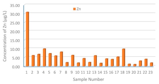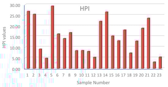The heavy metal contamination index (HPI) is a valuable tool for evaluating the influence of particular HMs on the overall quality of water and the suitability of surface water for human consumption []. The HPI values indicate the combined impact of various elements on the overall water quality, according to the recommended standard levels (Si) for each metal []. Results of HPI for Al Lith seawater ranged from 3.10 to 29.37, with an average of 14.90 (Figure 4), indicating a moderate level of pollution []. Out of the total samples, 13 (1, 2, 5–8, 13–17, and 19–21) exhibited HPI values exceeding 10, indicating a high level of pollution. Additionally, seven samples (3, 9–12 18, and 23) had HPI values ranging from 5 to 10, suggesting a moderate level of pollution. The remaining three samples were classified as having low pollution []. The samples with higher concentrations of HMs, including Cd, Pb, and Zn, revealed higher HPI values. The samples with higher pollution indices were primarily taken at the mouth of Wadi Al Lith. This suggests that the related HMs may have originated from the volcanic and metamorphic rocks of the Arabian Shield [].