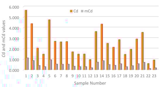 The contamination degree (Cd) evaluates the degree of contamination []. This assesses the extent to which pollution affects water quality in relation to specific hazardous materials. The water contamination degrees were calculated using Cd values, which represent the amounts of certain hazardous materials that exceeded the permissible limits []. The Cd values exhibited substantial diversity among the many investigated sites along the Al Lith shoreline. The Cd results varied from 0.60 to 5.65, with an average of 2.61, suggesting that the overall examined seawaters had low contamination levels [,]. Nevertheless, the analysis of Cd values for each sample location (Figure 3) revealed that samples 1, 2, 5, and 14 (which account for 17.39% of the total samples) exhibited Cd levels ranging from 4 to 8, indicating a moderate level of contamination []. The distribution pattern of the mCd (WQI) closely resembles that of the Cd. The water quality index (WQI) is a reliable approach for assessing water quality and providing assistance to policy-makers. It combines various water quality criteria into a single numerical value that reflects the overall quality of water [,]. The WQI values varied from 0.119 to 1.130, with an average of 0.521, suggesting that the saltwater was not polluted [].