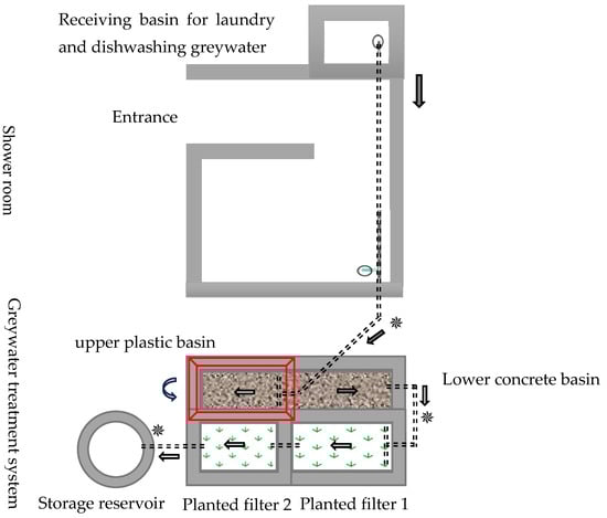 The greywater management facility (Figure 1) is composed of three main components: a shower room, a receiving basin, and a greywater treatment system developed using locally available materials (plastic tanks, local plants, concrete, and granitic gravel and sand as filter media). The design of the shower room was based on the system reported previously by Maiga et al. [] with slight modifications to allow for the collection of shower greywater that then flows to the treatment system using gravity. Issues related to laundry and dishwashing greywater collection are solved by integrating a receiving basin (internal L × W × H: 0.7 m × 0.5 m × 0.3 m) for collection of laundry and dishwashing greywater, connected to the shower room and located inside the courtyard. After laundry and dishwashing activities, the collected greywater is discharged into this basin, from where it can flow to the treatment system located outside the courtyard, through the same pipe as the shower greywater. To ensure that the entire study took place under real conditions, the system was operated in batch mode, receiving greywater as soon as it was produced by a user in the household.