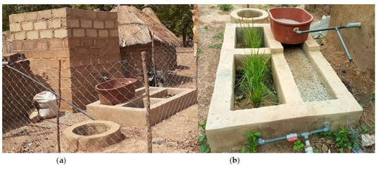 Unfortunately, a recent analysis to determine the global regions where most greywater research originates clearly showed the lack of research originating from Sub-Saharan Africa [] when compared to high-income countries. Nevertheless, in rural areas with similar context to our research study, several challenges must be overcome, specifically the collection of multiple greywater sources generated within a household in order to have sufficient quantity for gardening, the transfer of collected greywater using gravity and then through the treatment system without the need for the input of mechanical energy, the need to use locally available materials to ensure affordability, and the lack of data in this particular context.