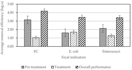 At the end of the pre-treatment step, the average removal efficiency was greater than 1.5 log10 units for all fecal indicators. Except for E. coli, the contribution of the pre-treatment phase to the removal of fecal bacteria was slightly higher than that of the planted section (Figure 3). This situation can be explained by several factors including the microbial loading associated with the influent, because adsorption and precipitation occur with the solid substrate as the greywater passes through the pre-treatment phase. This observation is supported by Wu et al. [] who reported in a review that the removal of microbial species is exponentially related to the loading rate. The removal efficiency increased to 3.45 and 3.41 log10 units for E. coli and the enterococci and up to 4.19 log10 units for fecal coliforms (Figure 3) as the greywater passed through the whole treatment system. The observed residual E. coli content in the treated effluent was lower than 5 log10 units, consistent with the WHO guidelines suggested for greywater reuse in restricted irrigation [].