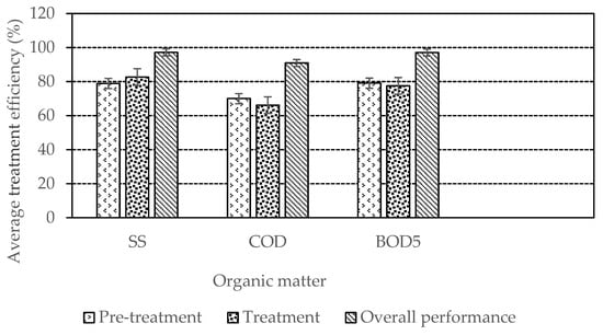 The treatment efficiency (TE) for organic matter (SS, BOD5, and COD) was observed to be greater than 70% after the pre-treatment phase. The contribution of the planted section to removal was approximately the same as that of the pre-treatment phase (Figure 4). However, it may be greater than the reported values since the raw greywater used as influent for the pre-treatment contained more pollutants than the influent used for the planted section. Indeed, Wu et al. [] observed a positive correlation between COD loading rate and COD removal rate.
