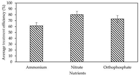 If the desired reuse option of the treated greywater is for irrigation, it makes less sense to remove nutrients (nitrogen and phosphorus) as suggested by von Sperling and Platzer [] and Oakley []. Nevertheless, we are evaluating the treatment efficiency of nutrients to know the real performance of our treatment system operated in the Sahelian climatic conditions. As shown in Figure 5, the treatment efficiency of all nutrients is greater than 60% with remaining concentrations of 9.46, 158.00, 6.91 mg/L for nitrate, ammonium, and orthophosphate, respectively, measured in the treated effluent.