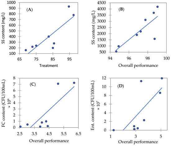 Correlation analysis between influent quality parameters (SS, fecal coliforms, and enterococci) and the removal efficiency of the treatment system. (A) Correlation between SS content of the pre-treated greywater and the treatment efficiency of the planted section (R2 = 0.705, p < 0.01); (B) correlation between SS content of the raw greywater and the overall performance of the treatment system (R2 = 0.665, p < 0.05); (C) correlation between fecal coliforms content of the raw greywater and the overall removal efficiency of fecal coliforms (R2 = 0.666, p < 0.05); and (D) correlation between enterococci content of the raw greywater and the overall removal efficiency of enterococci (R2 = 0.550, p < 0.05); SS: suspended solids; FC: fecal coliforms; Ent. = Enterococci.