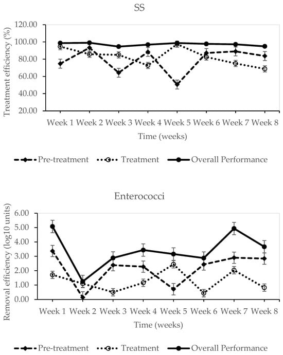 Based on the correlation analysis, SS and enterococci were selected to show the evolution of the performance of the different sections of the treatment system over time (Figure 7). For SS, the overall performance of the greywater treatment system is high, with low fluctuation in TE over time. The fluctuation is much larger in the pre-treatment phase compared to the treatment stage (planted section). This observation could be explained by the difference in the particle size of the materials used in each step. Overall, for the planted section, the performance seems high at the beginning and declines from the sixth week (10th week of operation), while that of the pre-treatment stage stabilizes at slightly higher values. These findings could be linked to the progressive filling of voids by particulate matter (faster in the case of sand and longer in the case of granite).