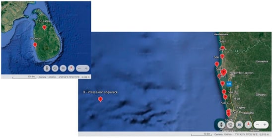 There is an urgent need for baseline data on MPs in Sri Lanka, particularly in the aftermath of the X-Press Pearl environmental emergency. A fire onboard resulted in the vessel capsizing and losing all cargo off the west coast of Sri Lanka [41]. On 21 May 2021, there were fires and explosions, which were suspected to be caused by a nitric acid leakage. Ten days later, the wreckage sank onto the seafloor. This tragedy is regarded as the worst accident in Sri Lankan maritime history, involving a single cargo container carrying chemicals and plastics [42]. It has had serious adverse effects on the fragile coastal environment, the local population, and the economy of Sri Lanka through the spilling of more than 1750 tons of plastic pellets—the largest-ever amount of plastic pellets to be spilled, containing a variety of hazardous materials from the X-Press Pearl cargo.