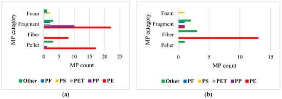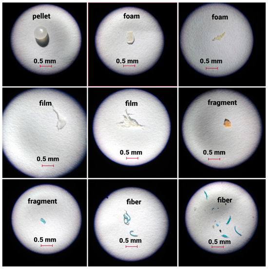 The recovered MPs were classified into five categories based on their shape (Figure 2): fibers, fragments, pellets, foam, and films.