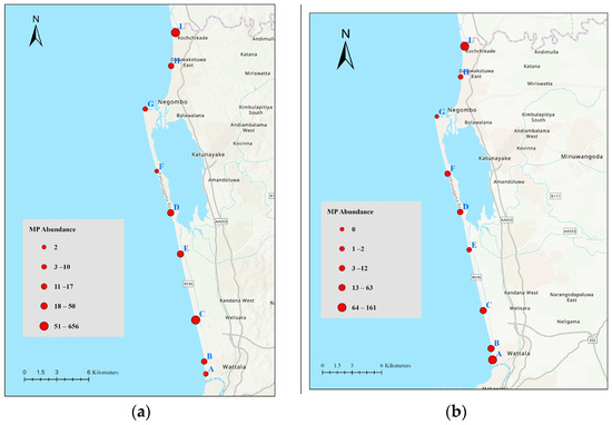 The abundance of MPs along the west coast of Sri Lanka in (a) sediment and (b) water, where the circle size illustrates MPs’ abundance at each site. Esri. 2024. ArcGIS Pro 3.3. Environmental Systems Research Institute, Redlands, CA. Basemap data copyright Esri.
