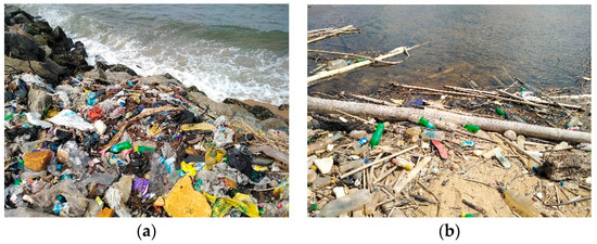 Since Sri Lanka is a tropical island, it has a diverse range of ecosystems along its shoreline. In addition, the island is surrounded by offshore coastal areas in the eastern, southern, western, and northwestern regions. Studies have shown that excessive concentrations of MPs have been found in beach sediments, water in marine protected areas [35], marine beaches [36], and marine biota [37] all along the coastline of Sri Lanka. Studies performed to evaluate the amounts of microplastics in Sri Lankan waters indicate that the West Coast waters are more MP-polluted than those of the East Coast [38]. Additionally, recent studies were carried out to evaluate the potential toxic elements (PTEs) associated with the concentrations of plastic nurdles, pyrolytic debris, and coastal contamination. Furthermore, prevention strategies have been taken in response to the biggest coastal accident ever to have occurred in Sri Lankan waters, involving the presence of chemicals, cosmetics, and plastics in cargo containers on board the MV X-Press Pearl [39,40]. However, most data in the local context have been insufficiently analyzed and reported. Furthermore, the effects of plastic pollution on Sri Lanka’s western coastline region have not received adequate attention.