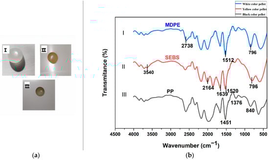 (a) Differently colored pellets from beach sediments. (b) FTIR spectrum of differently colored pellets from Site C.