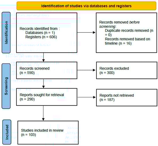 The process followed during the selection of studies is depicted in the flowchart in Figure 1. In the initial phase, the search yielded 606 records from the databases, including 16 documents that were over 10 years old. Following an initial screening of abstracts, 300 articles were eliminated due to their lack of relevance to wastewater treatment. A comprehensive review of the full texts of the remaining 290 papers resulted in the exclusion of 187 studies that did not feature case studies.