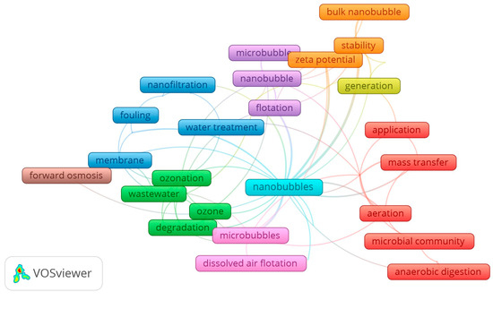 Figure 2 displays a co-occurrence analysis of keywords, visually depicting the relationships among terms based on their frequency and organizing them into distinct color-coded clusters. In this analysis, the blue nodes group keywords associated with “water treatment” linked to membrane processes such as nanofiltration. The purple cluster encompasses keywords related to flotation processes. The red nodes cluster terms related to aeration processes, connected to the microbial community, flotation, and dissolved air flotation, indicating a growing interest in NB aeration in biological processes. The orange cluster underscores the properties of NBs, mostly their stability and the zeta potential. The green cluster relates to advanced oxidation processes (AOPs), emphasizing using NBs and ozone as oxidants. The presence of the keyword “generation” in this context indicates the different generation methods for NBs.