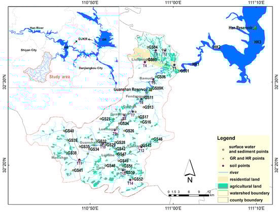 The Danjiangkou Reservoir (DJKR) is the water source for the Middle Route of China’s South to North Water Transfer Project. The water quality of the DJKR is related to water supply safety in North China. Although the water quality of the DJKR was stable and good in 2015–2019 [10,36], the water deterioration (mainly eutrophication) in the major tributaries flowing into the reservoir was evident [7,37,38], which poses a potential threat to the water quality of the DJKR. It is urgent to explore nutrient migration and regulation in the tributaries. The Guanshan River is a typical agricultural polluted tributary located in the southwest of the DJKR [37,39]. Although the basin area of the Guanshan River is small, the nutrient output per unit area was relatively high [39]. Short runoff [40] and intensive agricultural activities in the basin entrained large amounts of N and P into the DJKR [39]. However, existing studies in the Guanshan River mainly focused on monitoring water quality in the estuary [37,39,40], with little attention to N and P regulation at the basin scale.