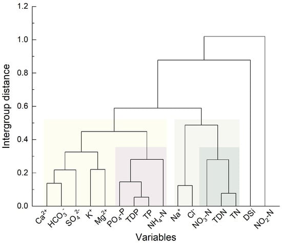 Earlier research explored the major sources of N and P in the DJKR [7,9,38]. However, there have been few efforts to subdivide the sources of different nutrient forms. Consequently, CA was used to identify the sources of diverse nutrient forms in the Guanshan River based on the NO3-N, NO2-N, NH4-N, TDN, TN, PO4-P, TDP, TP, Na+, K+, Mg2+, Ca2+, DSi, Cl¯, HCO3¯, and SO42¯ data in the water. The dendrogram derived from CA revealed two categories, encompassing four different classes (Figure 3).