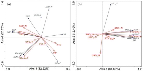 Redundancy analysis of nutrient forms in the soil−water−sediment system: (a) the RDA map that used sediment nutrients as the response variable and nutrients in undisturbed and agricultural soils as the influencing factor; (b) the RDA map that used nutrients in the water as the response variable, with sediment, undisturbed soil, and agricultural soil nutrient as the influencing factor. The initial letters ‘R’, ‘S’, ‘A’, and ‘U’ before the nutrient form represent nutrients in water, sediment, agricultural soil, and undisturbed soil, respectively.