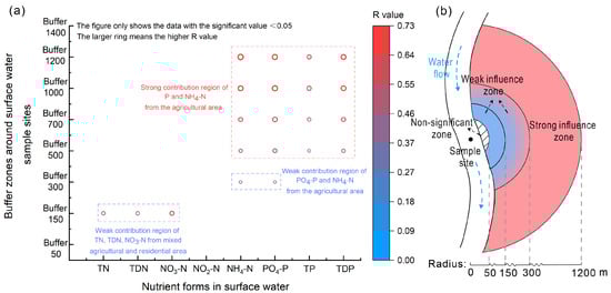 Scale effects of different sources of nutrients in river water: (a) the correlations between the agricultural area with phosphorus and nitrogen in nearby river water in different buffer zones for the Guanshan River; (b) schematic diagram of scale effects of the agricultural area within buffer zones.