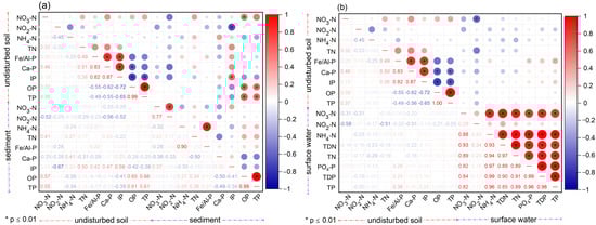 Correlations between nutrients in undisturbed soil with those in sediment and water in the Guanshan River Basin: (a) correlation between undisturbed soil and sediment; (b) correlation between undisturbed soil and water. The size of circles corresponds to the strength of the correlation.