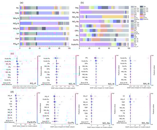 XGBoost analysis of nutrient forms in the soil–water–sediment system: (a) feature importance that used river water nutrients as dependent variables and nutrients in sediment, undisturbed soil, and agricultural soil as independent variables; (b) feature importance that used nutrients in the sediment as dependent variables and nutrients in river water, undisturbed soil, and agricultural soil as independent variables; (c) SHAP values predicted by dependent variables for nutrients in river water (the red and blue represents the value of the independent variable, and the SHAP value represents the predicted value of the dependent variable corresponding to the independent variable); (d) SHAP values predicted by dependent variables for nutrients in river sediment. The suffix letters ‘s’, ‘a’, and ‘u’ of the nutrient form represent nutrients in sediment, agricultural soil, and undisturbed soil, respectively.