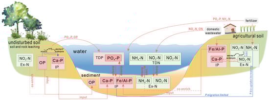 Furthermore, during migration at water–sediment or water–soil interfaces, nutrients may undergo morphological transformations driven by physicochemical and biological processes, which may have an impact on nutrient accumulation in water [15,16]. N and P interactions in different forms considerably impact nutrient adsorption and release in environmental media [11,16,17]. Previous research has proved that NO3-N accumulation in the sediment maintains an aerobic environment, hence inhibiting phosphate (PO4-P) released from iron/aluminum-bound phosphorus (Fe/Al-P) [18,19,20,21,22]. However, NO3-N accumulation processes, such as nitrification and mineralization, could also produce proton (H+) [23] and organic acid, thus dissolving detrital P in the sediment [24,25], resulting in PO4-P enrichment in the water [26]. NH4-N can stimulate biological activity in the soil/sediment, which has diverse impacts on PO4-P content in the water under different nutrient limitations [27,28]. PO4-P can also affect microbial activity and redox conditions, further influencing the nitrogen transformation in water and solids [29]. Comprehending the mechanism behind the interactions between N and P could assist with the synergistic management of nutrients [16,30]. Further research is still required due to the complexity of the N and P coupling interaction under different conditions.