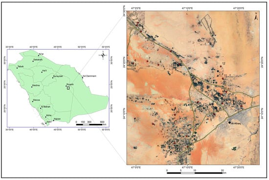 The study area lies to the south-east of Riyadh and includes the city of Al-Kharj. It is situated between latitudes 24°–24.5° N and longitudes 46.7° E–47.4° E (Figure 1). Figure 2 shows some images from the study area. The area has an arid climate with temperatures ranging between 48 °C in summer to about 3 °C in winter. The average annual rainfall in the region is less than 100 mm and the annual evaporation rates are as high as 2000 mm [13]. The elevation ranges between 650 m and 320 m above mean sea level. The northwestern part of the study area, east of the main highway corresponds to the Sulaiy escarpment (Figure 2). The Nisah graben can be seen in the southwestern part of the study area (Figure 3).