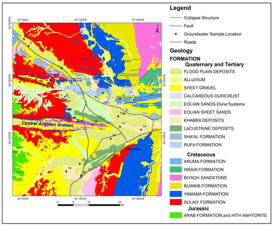 Quaternary alluvial deposits in the study area contain aeolian quartz, sand, and pebbles, interspersed with layers of sandstone and limestone boulders. These unconsolidated alluvial deposits form shallow aquifers recharged by infrequent rainfall. Structural features such as the Wadi Nisah graben and the Rufa graben run from west to east in the research area. The Sulaiy and Yamama outcrops exhibit collapse structures and karst features [19].