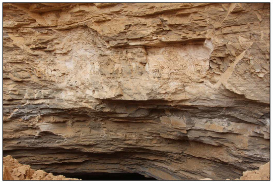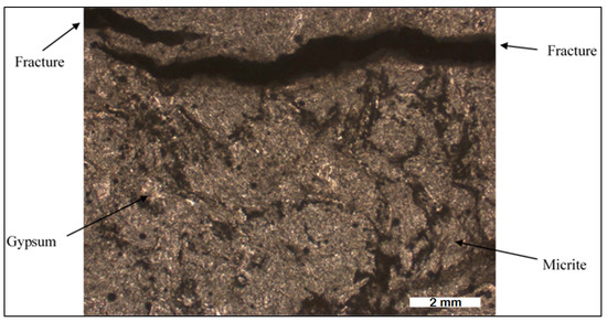 Detailed analysis of 13 rock samples obtained from the transition zone between the Hith and Sulaiy formations at Dahal Hith was carried out. The upper portion of the Hith Formation is characterized by the prevalence of laminated anhydrites, as depicted in Figure 4, with varying thicknesses extending to several tens of meters, as reported by [15]. The fine layering, ranging from millimeters to centimeters in thickness, suggests a marine origin for these anhydrites. Photomicrographs from thin sections reveal the presence of gypsum, micritic carbonate, and fractures facilitating water movement (Figure 5).