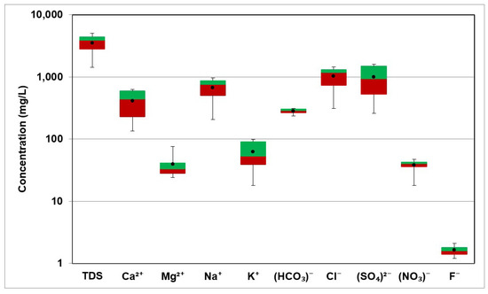 The geology of the aquifer determines how the hydrochemistry and hydrochemical processes vary both geographically and over time. The analyzed parameters were Ca2+, Mg2+, Na+, K+, HCO3−, SO42−, Cl−, NO3− and F−. Table 2 displays the values of the obtained parameters for the 21 samples. Table 3 displays the statistics of the examined parameters, including minimum, maximum, mean, and standard deviation. Figure 6 shows the box and whisker plot for the TDS and the major ions.