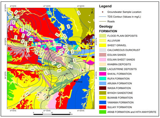 The values of Electric Conductivity ranged between 1550 µS/cm and 7650 µS/cm and the average value was 5003.54 µS/cm. The TDS values ranged between 1433.3 mg/L and 5063.5 mg/L, with an average value of 3515.87 mg/L. Water–rock interactions resulting in the dissolution of highly soluble minerals (halite and anhydrite) are the main sources of high TDS values in groundwater. Figure 7 shows the spatial distribution of TDS in the study area.
