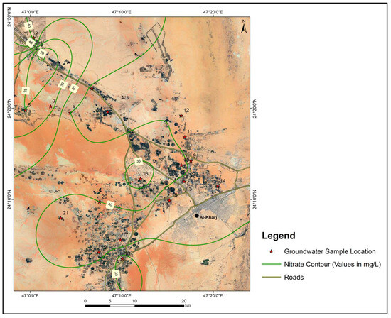 The average NO3− concentration in groundwater samples was 38.1 mg/L, while values ranged from 18 mg/L to 47 mg/L. The NO3− (nitrate) levels in the groundwater of the study area are within the World Health Organization’s [24] maximum permissible limit of 50 mg/L, ensuring compliance with public health standards. However, the authors of [25] have identified that the natural background level of nitrates in an arid region is significantly lower, at 7.2 mg/L. This contrast indicates that the nitrate levels observed in the present study, although below the threshold described by the authors of [24], are elevated relative to the natural background concentrations. Such an elevation is likely attributable to agricultural activities, which commonly involve the application of nitrogen-based fertilizers. Figure 8 presents the spatial distribution of NO3− in the study area. Sewage waste also sometimes results in a high concentration of Na+ and Cl− in groundwater. As can be seen from the satellite image in the figure, all the samples were collected from agricultural farms, which satisfactorily explains the observed levels of NO3−.