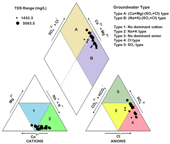 The Piper plot for the analyzed sample is shown in Figure 9. On the cationic triangle, two types of groundwater can be seen. Type 1 is the mixed cationic species which does not show the dominance of any one cation, whereas in Type 2, the dominance of Na+ + K+ can be seen. On the anionic triangle, three types of groundwater can be seen, including the no dominant anion (Type 3), the Cl type (Type 4), and the SO42− type (Type 5). On the diamond of the Piper plot, two main hydrochemical facies can be identified: the (Ca2+ + Mg2+)–(Cl− + SO42−) Type (Type A) and the (Na+ + K+)–(SO42− + Cl−) Type (Type B). Most of the samples belong to Type B and represent the typical groundwater facies found in an environment dominated by the solution of evaporite minerals. The absence of (Ca2+ + Mg2+)–(CO32−+ HCO3−) type of groundwater probably reflects the saturation of water with respect to carbonate minerals.