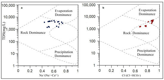 Constructing a plot between TDS vs. Na+/(Na+ + Ca2+) and TDS vs. Cl−/(Cl− + HCO3−), known as Gibbs diagrams, helps us to understand the interaction between rock and water [28]. It illustrates the connections between the various systems that affect the chemistry of water. The following equations, where all values are in meq/L, have been used to plot the results of the chemical analysis of water on the Gibbs diagram.