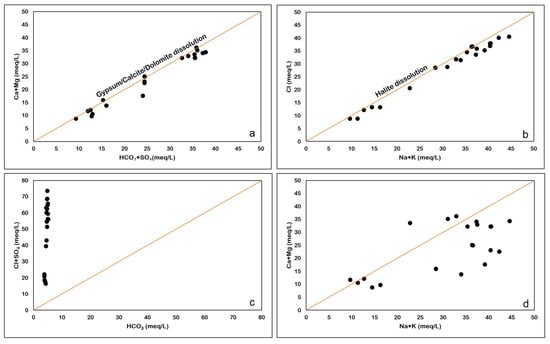 It is very important to study the relationship between major cations and anions, as they can give us an idea about the role of different processes, such as dissolution, water–rock interaction, anthropogenic activities, and the precipitation of minerals. The plot between Ca2+ + Mg2+ and HCO3− + SO42− assesses the natural bonding affinity between Ca2+ + Mg2+ and HCO3− + SO42− (Figure 11a), which may be due to gypsum/ anhydrite and calcite dissolution. It is evident from the geology of the study area that anhydrite (Hith Formation) and calcite (Sulaiy Formation) are the dominant aquifer lithologies from which groundwater is obtained, mostly for irrigation purposes. Most of the samples are plotted along the gypsum/calcite dissolution line indicating that sulfate and carbonate weathering are dominant in the study area.