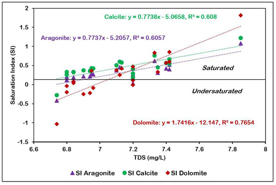 The saturation index of gypsum, anhydrite, and halite have been plotted against TDS in Figure 13. The minerals are undersaturated in groundwater and show a strong positive correlation with TDS. The undersaturated state of gypsum is indicative of the fact that the groundwater is capable of dissolving more gypsum. Gypsum/anhydrite dissolution from the Hith Formation underlying the Sulaiy formation is responsible for the presence of Ca2+ and SO42− in the groundwater. The average value of the saturation index is the inverse of their solubility in groundwater and, in this study, are in roughly the following order: halite (−4.93), gypsum (−0.46), anhydrite (−0.73), calcite (0.44), aragonite (0.3) and dolomite (0.25).