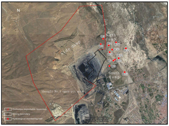 The coal-bearing stratum of Shengli No. 1 Open-pit Mine is the Cretaceous Shengli Formation, and the main recoverable coal seams are 5 coal seams and 6 coal seams. The 5 coal seams are 0.10–36.52 m thick throughout the area, and the average thickness is 16.27 m. No. 6 coal is the first main retractable coal seam, with a layer thickness of 0.40–95.47 m and an average thickness of 33.42 m. At present, the open-pit mine is about 2.35 km long from east to west and 2.65 km wide from north to south. There are two dumping sites in the east and south, in addition to the dumping sites located in the north. On behalf of monitoring the influence of open-pit mining on groundwater, 12 hydrological monitoring wells have been deployed in the east since 2008 to continuously monitor the underground waterline (Figure 1).
