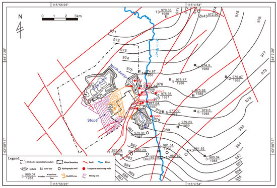 At present, the general trend of the groundwater level in the east of the open-pit mine is gradually decreasing from south to north, and the water level elevation has dropped from 975 m to about 970 m. Compared with the background value, the waterline of the quaternary aquifer has decreased. Compared with the background value, the current water level near the stope has decreased by about 4–6 m, and the water level in the northern mine has decreased slightly.