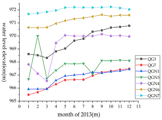 The quaternary aquifer diving water level is affected by atmospheric precipitation recharge, evaporation, runoff and drainage, and the water level also changes to some extent throughout the year [39]. During the year, the atmospheric precipitation is mainly concentrated from June to August, accounting for about 71% of the annual precipitation. The groundwater level is affected by it. From January to April, the water level for the whole year is relatively low. It gradually increases in May, and the water level in some wells remains unchanged or increases slightly from September to December.