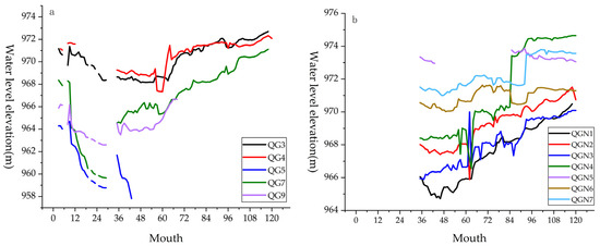 During the mining process of Shengli No. 1 open-pit mine, continuous monitoring wells have been deployed since 2008. Among them, five hydrological wells started being monitored in 2008 (Figure 4a) and seven hydrological wells started being monitored in November 2010 (Figure 4b). The monitoring data were collected once a month, and the monitoring time totaled 120 months. As can be seen from Figure 4, since 2008, the eastern mining area of Quaternary aquifer groundwater level has experienced a slower, stable and increasing process of change, mainly in the lower level of the years 2010 to 2012, and the water level has gradually changed overall. Compared with the water level data initially monitored, the water level of most monitoring wells is higher than the water level during initial monitoring, and the groundwater level in the eastern mine is gradually rising.