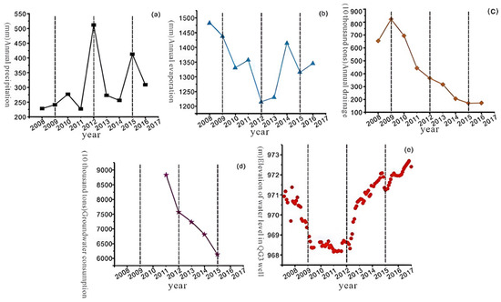 The waterline change and influencing factors. (a) Annual precipitation since 2008; (b) Annual Evaporation since 2008; (c) Annual dredging since 2008; (d) Groundwater use since 2008; (e) QG3 well water level elevation since 2008.