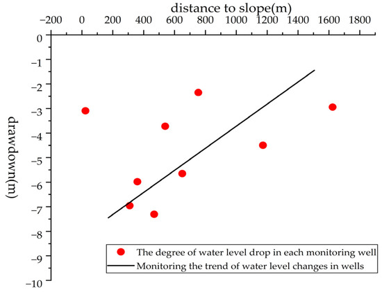 The relation graph between waterline change and distance of monitoring wells to coal mine.