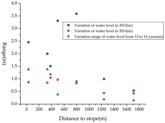 Table 4 shows the water-level data of different hydrological monitoring wells in 2013 and 2014. The nearest monitoring well is about 30 m from the stope, and the farthest monitoring well is about 1700 m from the stope. Comparing the changes in the water level of each monitoring well during the year, in addition to QGN3 and QGN4, the water levels of other wells in 2013 and 2014 had the characteristic of decreasing water level changes with increasing distance from the stope. In the same year, the same amount of atmospheric precipitation and evaporation is accepted at each drilling location. The amount of dredged water in open-pit mining is constant. The alteration in the waterline of monitoring wells at different distances is affected by the formation permeability and water richness of the monitoring wells on the one hand, and by the mining dredging on the other. The effect of dry action dredging was added to the influencing factors and compared to conventional groundwater level monitoring methods [40,41,42]. The effect of dredging on surrounding formation water is gradual, and the effect gradually decreases from the dredging wells surrounding the stope to the outside.