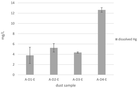 The eluates contain Hg concentrations between 3.7 and 12.6 mg L−1. Differences can be determined between and within the charges of the plant (for A-D1-E, between 1.4 and 4.7 mg L−1 (Table 6) and the standard deviation in Figure 1) that were taken over a time period of one year. The mean value and standard deviation for all samples were calculated with six values. Especially the sample A-D4-E contains a high concentration of dissolved Hg (12.6 mg L−1). The Hg concentrations in all eluates exceed the emission limit value of 0.005 mg L−1 and have to be reduced. Although the dusts were sampled in small amounts (sample A-D1, A-D2 and A-D4), the results show inhomogeneities and high standard deviations within the dust samples.