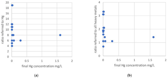 (a) Relation between the final dissolved Hg concentrations and the ratio referred to the initial Hg concentration; (b) relation between the final dissolved Hg concentrations and the ratio referred to the initial concentrations of precipitable heavy metals. Y-axis has different scales.