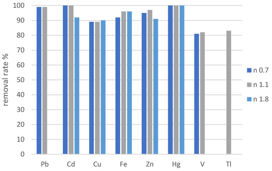 Table 7 and Figure 3 show that a higher ratio of solid Na2S does not necessarily lead to a higher removal of HM. A Na2S ratio of 1.1 resulted in the removal rates of Hg, Pb, Cd, and Zn being higher than 95%, while those of Fe and Cu were higher than 90% and V and that for Tl was over 80%. For Hg, the ratio (Strategy 2) should be more than 1.5, but the application of an excessive amount of Na2S would cause material waste and a secondary pollution due to the excess of sulfide [37]. Due to the high salt concentrations and the other present metals, it is expected that the precipitants do not only form insoluble complexes with Hg; the other metals are precipitated, too. For an efficient removal, the adjustment of the precipitator in the initial concentration of all precipitable heavy metals will be necessary. Due to the formation of the soluble Hg–polysulfide complexes, the Hg concentration can increase after the precipitation again, because this complex is not stable. The results show that also other heavy metals like Cu, Zn, Ni and Sn form soluble complexes with S, which supports the reported results in the literature [24,25,43]. The work of Fukuta et al. (2004) showed removal rates of 94.5% for Cu (pH 1.5), 75.9% for Zn (pH 2.5) and 65.9% for Ni (pH 5.5–6.0) [25]. A further study of Mahdi et al. (2012) showed that 90% of Cu, Ni and Zn could be reduced from a synthetic solution with Na2S in 30–60 min with the additional control of the sulfide concentration in the solution with thioacetamide (CH3CSNH2) as an addition to the precipitator to prevent the overdosage [19]. The work of Silvia et al. (2017) presents Cu, Zn and Ni removal over 90% with H2S gas [20]. The results of both studies are comparable with our study and show that the use of H2S is as efficient as Na2S for the removal of Cu, Zn and Ni. In another study, heavy oil fly ash with over 9.0% (weight per weight) of sulfur content has removed 99.99% of Cu from a synthetic solution under optimal operational conditions [26]. The removal treatments in all of the mentioned studies were applied to synthetic solutions, and different sulfide sources were used. The comparison of the results of the experiments of this study show that the removal rates are in the same range, although the wastewater used in our study had a high ionic strength. The concentrations of salts in the treated solution did not have an impact on the efficiency of heavy metal removal by sulfide precipitation from different sulfide sources, but as the comparison with the study of Han et al. showed, other heavy metals react with sulfide too and are removed as precipitates [36].
