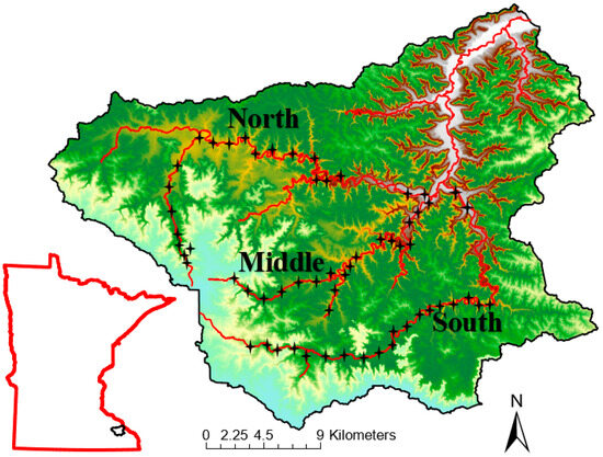 Each fork of the Whitewater River catchment, North, Middle, and South, are temperature-transitional sub-catchments. They are arranged from headwaters (HW), middle sections (MS), and lower sections (LS); coolwater, warmwater, and coldwater, respectively. A previous study [32] characterized each fork by section based on physical habitat, benthic macroinvertebrate index of biotic integrity, and fish index of biotic integrity. Our designations can be supported by stream management plans obtained from the Minnesota Department of Natural Resources Fisheries section in Lanesboro, Minnesota, USA. Each fork has specific designations for coldwater sections in river miles. Beginning at the confluence of each stream, going upstream, the lower 24.2 (North Fork), 23.3 (Middle Fork), and 20.8 (South Fork) river miles of each fork are designated as coldwater. Crow Spring drains into the Middle Fork downstream of the coldwater cutoff and is technically the coldwater section of the Middle.