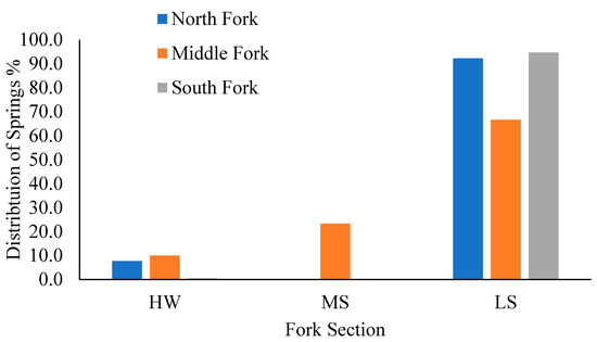 The distribution of springs in proportion form. Springs were unevenly distributed throughout each fork. Abbreviations are as follow: headwaters (HW), middle sections (MS), and lower sections (LS). The greatest concentrations were found in the LSs of each fork near the confluence into the mainstem. Data retrieved from the Minnesota Spring Inventory website (https://arcgis.dnr.state.mn.us/portal/apps/webappviewer/index.html?id=560f4d3aaf2a41aa928a38237de291bc: Accessed 10 March 2024) for the Whitewater River catchment located in southeastern Minnesota, USA.