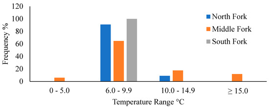 In total, 61 sites across the three forks (North, Middle, South) of the Whitewater River catchment were sampled for select environmental variables and fish. We identified 26, 30, and 19 springs in the three forks, with the greatest concentrations in the lower sections across each fork (Figure 2). Chi-square analyses revealed significant differences in spring distributions among stream sections within each fork (Table 1), whereas Chi-square contingency table analysis detected significant differences in the distributional patterns of springs among forks (X2 = 9.3, DF = 2, p = 0.05). Cumulative flow inputs into the lower sections of each fork were as follows: 459 L/s (North), 3978 L/s (Middle), and 1854 L/s (South). Chi-square contingency determined there were significant differences in flow inputs by section among the three forks (X2 = 290, DF = 4, p = <0.0001). The coldest temperature inputs from springs occurred in the LS of each fork, with inputs ranging from 5 to 9.6 °C (Figure 3). ANOVA revealed there were no significant differences in temperature inputs by section in each fork (F = 0.40, DF = 2, p = 0.67).