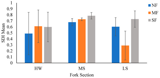 Fish community SDI values (unitless) obtained for each fork by section. Abbreviations are as follow, North Fork (NF), Middle Fork (MF), South Fork (SF), headwater (HW), middle section (MS), and lower section (LS). is the mean value (±one standard deviation) for SDI. All values are 1-D. ANOVA results are shown with f-statistic and p-value. Asterisk denotes significant differences. Data represented is for the three forks (North, Middle, South) of the Whitewater River located in southeastern Minnesota, USA.